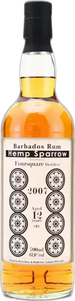 The fabrication process of Foursquare 2007 Hemp Sparrow begins with the selection of premium sugar cane molasses, which is fermented using a natural yeast strain unique to the distillery. Following fermentation, the wash undergoes double distillation in a combination of pot and column stills, a method that allows the distillery to capture both the rich flavors from the pot still and the lightness from the column still. After distillation, the rum is aged in a blend of ex-bourbon and Madeira casks, which impart significant character to the spirit over its 12-year aging period. The rum is then bottled without additional sugar or color, ensuring that the final product is representative of its pure form and unique origin without any enhancements to influence its taste or appearance.